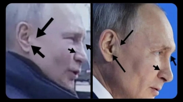 - Вуха: мочки різні, складки біля основи іноді є, іноді немає, відстань між очима та вухами різна: рот — вухо — дисбаланс. Є важливий нюанс — біометричні та інші показники вуха «путіних» не збігаються, а форму вух як відбитки пальців підробити практично неможливо.